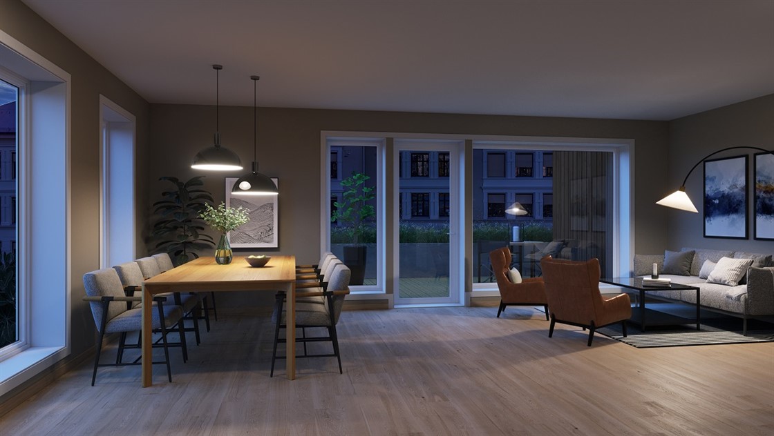 Fra hovedinngang/ parkeringsanlegg vil man kunne ta heisen opp til sin etasje hvor leiligheten har direkte adkomst fra trapperommet. Denne løsningen gir muligheten til effektive og spennende innredningsløsninger.