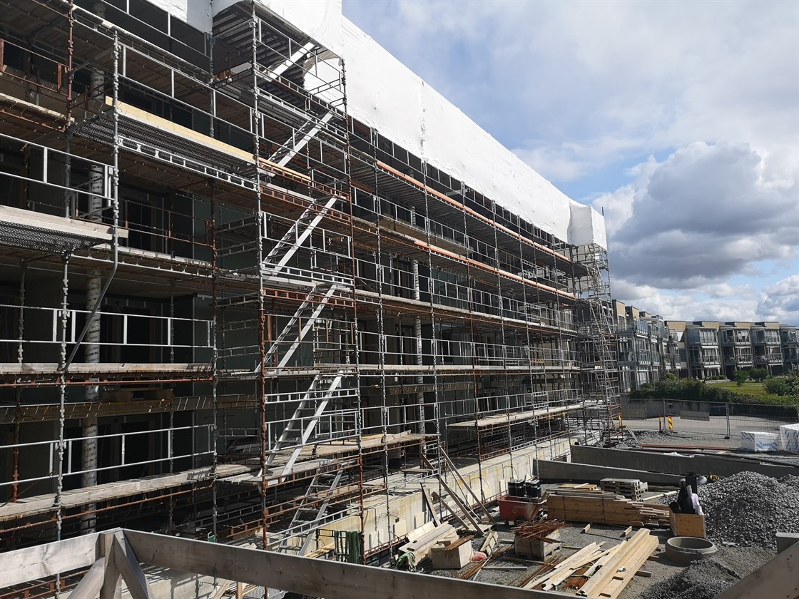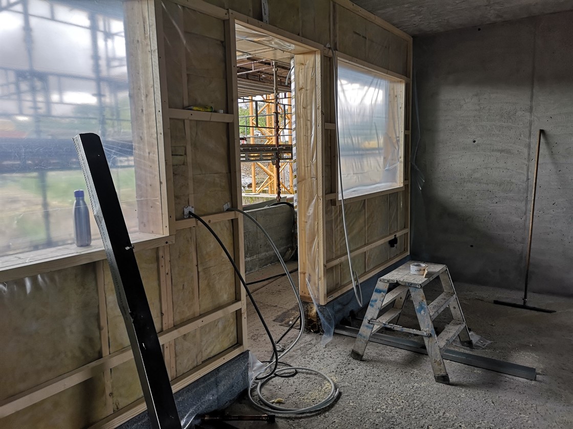 Innvendig har vi begynt å sette inn vinduer og lukke vegger. Noen leiligheter har fått gips på vegger allerede.