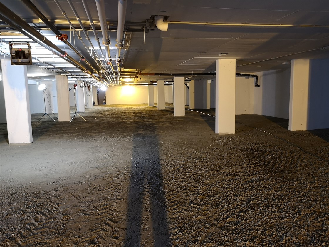 P-kjelleren er nå asfaltert. Taket er tett og tekniske fag er godt i gang med trekking og installasjon ihht tilvalg fra kunde.