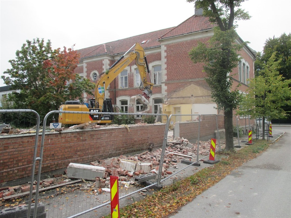 De første forberedende arbeidene er igangsatt. Riving av sidebygget er påbegynt, og snart står gymsalen og brannstasjonen for tur.