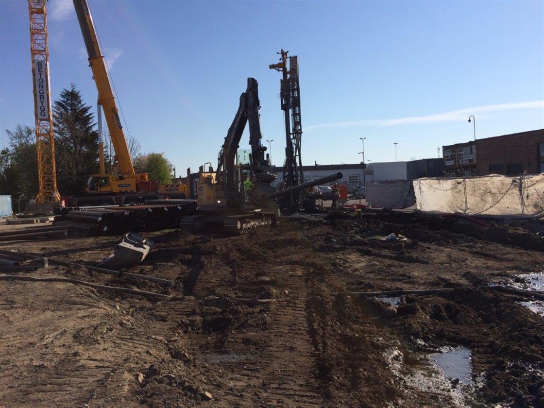 Spuntjobben er ferdig (avstiving gjenstår) og boring av stålkjernepeler er godt i gang! Det er ikke lenge før de første bilene er i gang med å kjøre bort løsmasser.