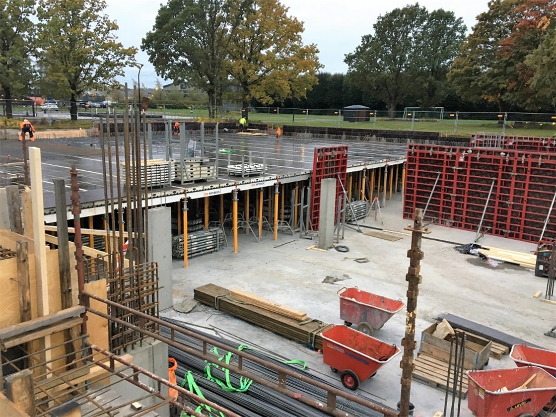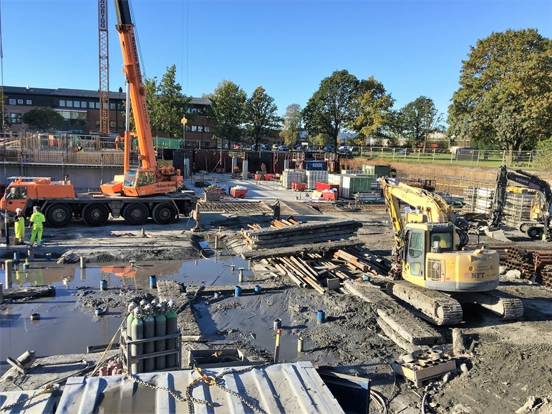 De omfattende pelearbeidene går mot slutten for tårn 2 og 3 (T2 og T3). Vi er godt i gang med betongarbeidene for garasje og T1. Første dekke T1 ble støpt i uke 41. Første del av dekke over kjeller blir støpt i uke 42. Vi begynner straks å reise forskaling for dekke over 1. etg. Da er klatringen igang!