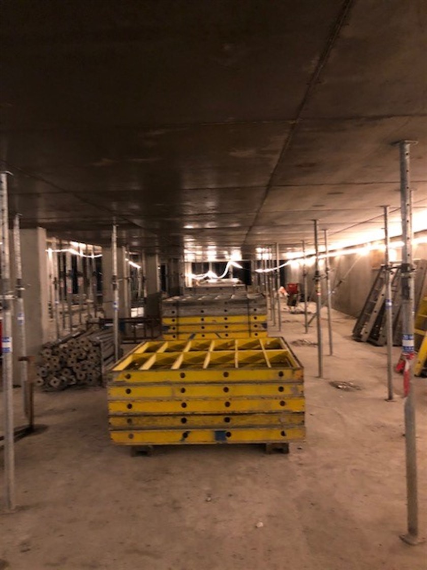Kjelleren for byggetrinn 1 er ferdig støpt og rivning av siste dekkeforskaling er snart ferdig.