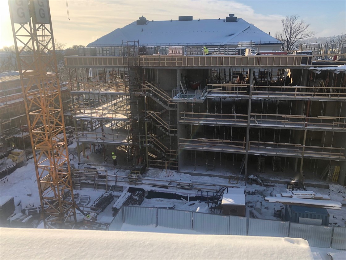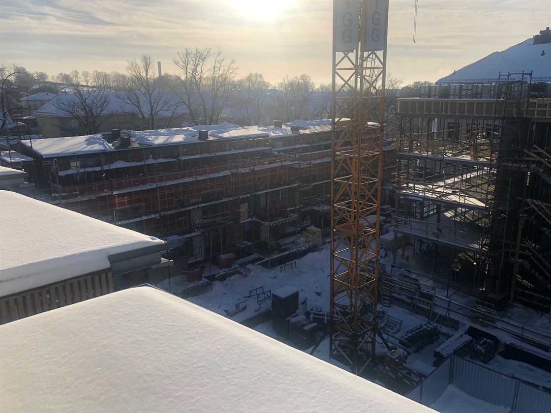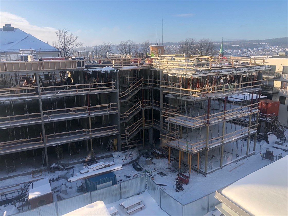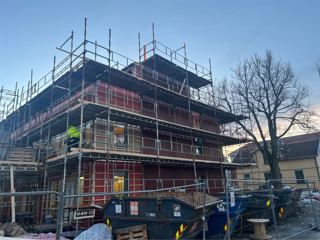 Byhusene har nådd milepelen med tett bygg og vi starter nå med ytterveggene på bygg B. Målet her er tett bygg i mai.